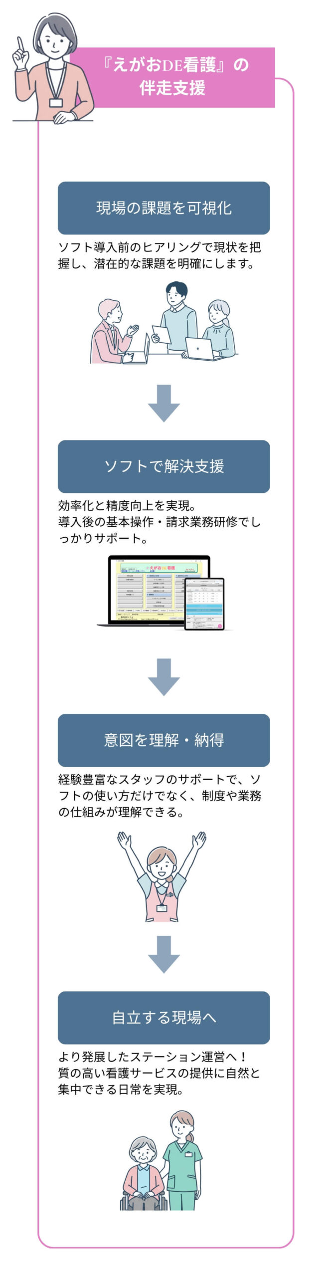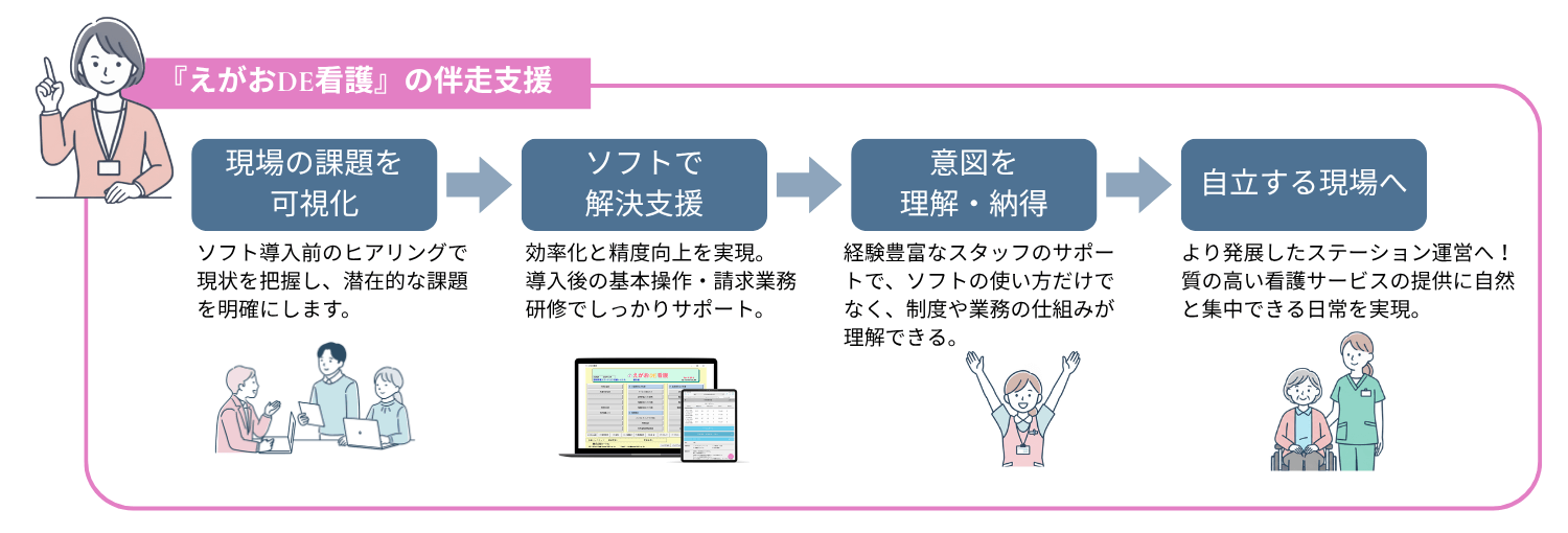 ソフトを通じて現場が自立し、「質の高い看護サービスの提供」に自然と集中できる日常を実現します。